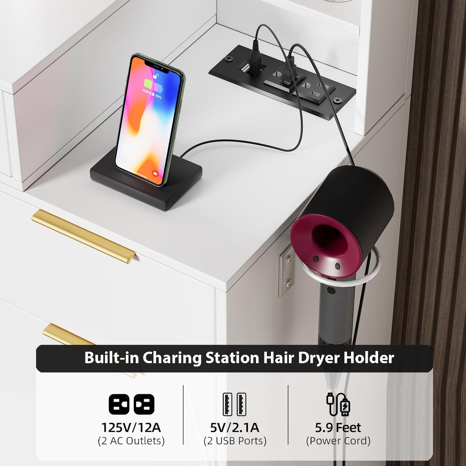 - 【Vanity Table with Charging Station】- This make up vanity adds an upgraded design with 2 standard plug sockets, 2 USB ports and hair dryer holder, allowing you to sit at your vanity and use your hair dryer or curling iron with the power strip within easy reach.