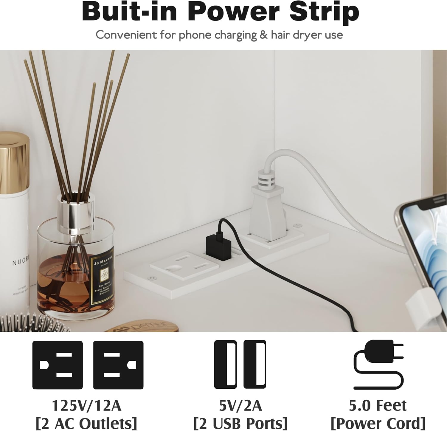 - [Power Outlet] The vanity bench is equipped with two sockets and two USB ports. It provides great convenience for charging your phone or other electronic device.